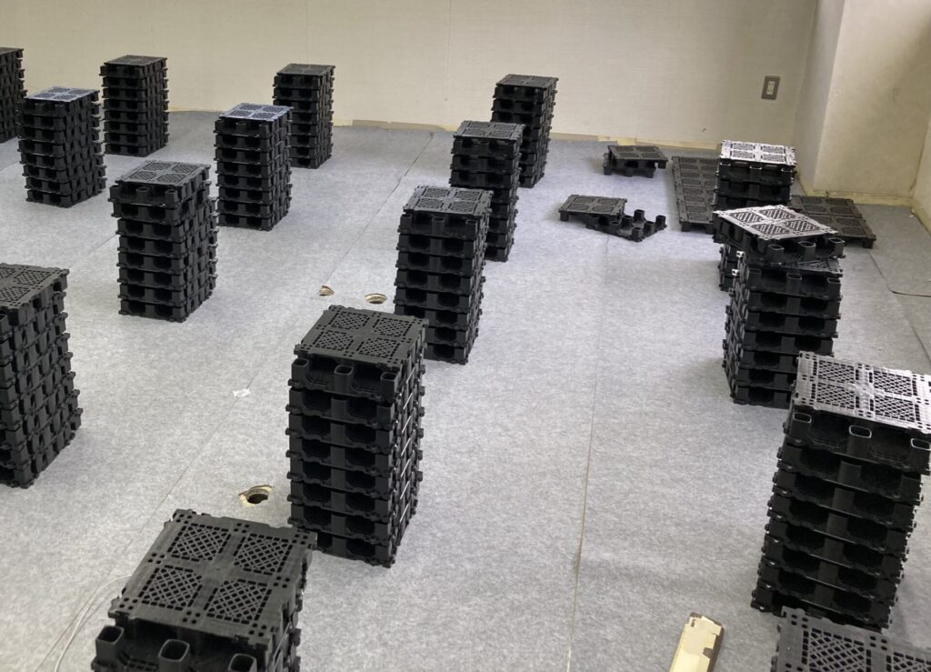 - 必要な部材(支柱・パネル・固定金具など)を搬入。※支柱がないタイプもあります。写真は置き敷タイプ。