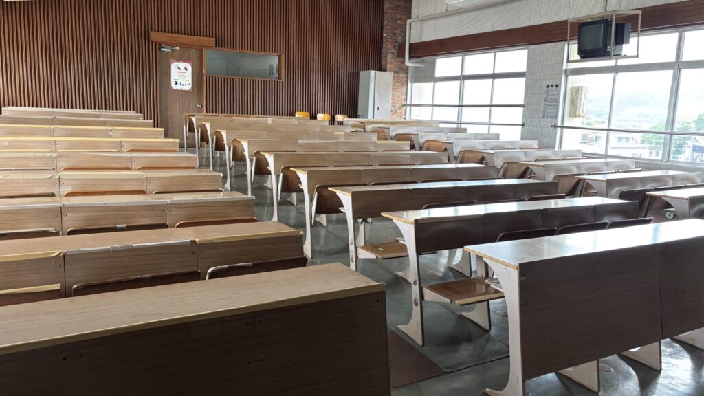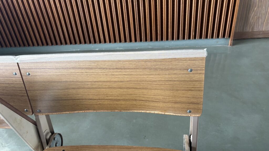 ご相談いただいたのは、視聴覚教室にある階段状(ひな壇)に設置された長机と椅子の修繕です。 長年の使用により、椅子の背もたれや一部に傷みや剥離が見られました。